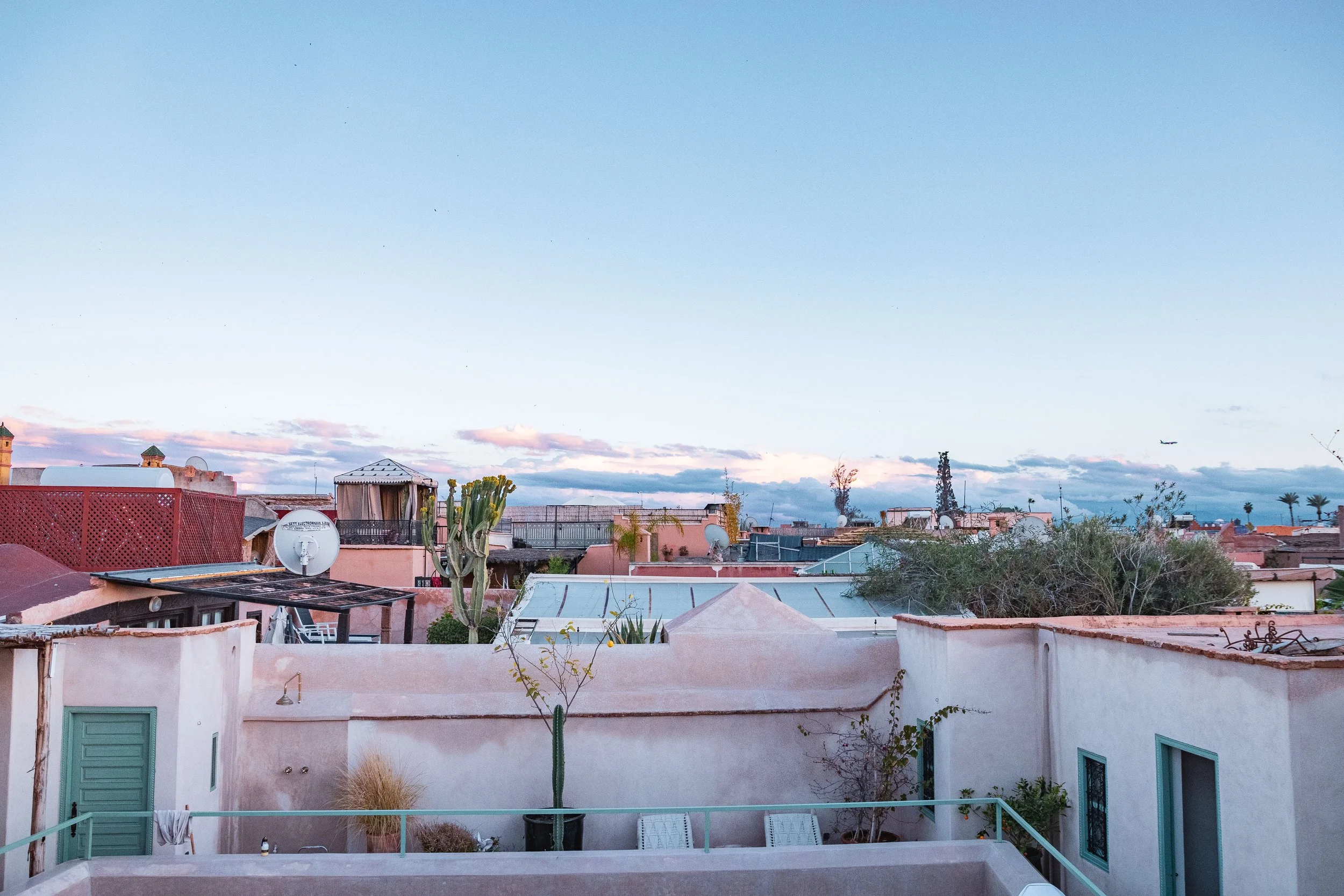 while watching the sun set behind the rooftops, with the Koutoubia Mosque rising on